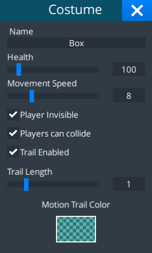 The Costume is an editable pickup that is used for hiding players, change the health and speed, collide with other players and makes their avatar invisible when equipped.
