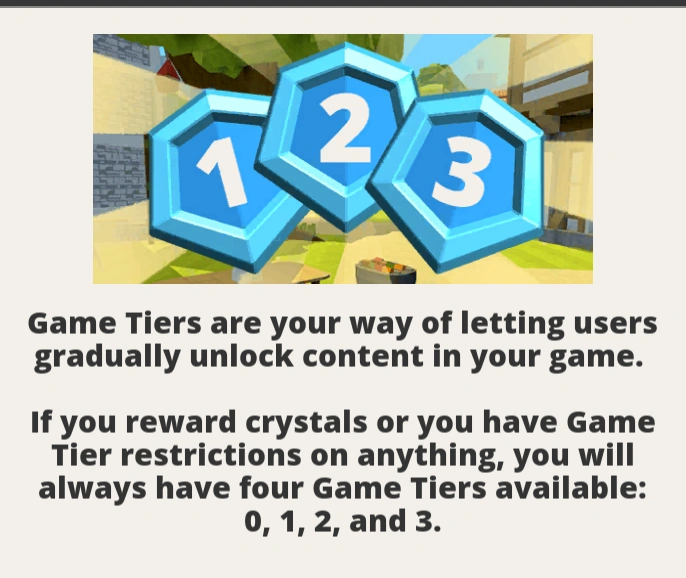 On Build mode, place Crystals in your map or set a Crystal reward for winning. The Game Tiers mode will then be automatically enabled. To keep setting it, establish the total of Crystals and the reward of Tiers. There will be 3 tiers. You'll start with tier 0 and progress until tier 3.