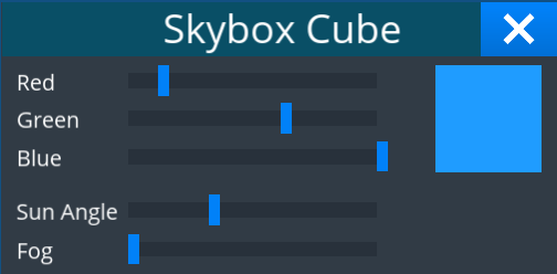 A Skybox is a Logic Cube used to modify the sun angle and sky color of a game. By right-clicking a Skybox, a user can find a "Settings" option that opens a GUI menu. In this menu, the user is given the option to combine the colors red, blue, and green in specific amounts in order to recolor the sky. The user is also given the option to alter the angle of the sun and the amount of fog in their game. Builders are also given the ability to enable/disable Logic Cubes by connecting them to other Logic Cubes, which can lead to the creation of weather cycles.